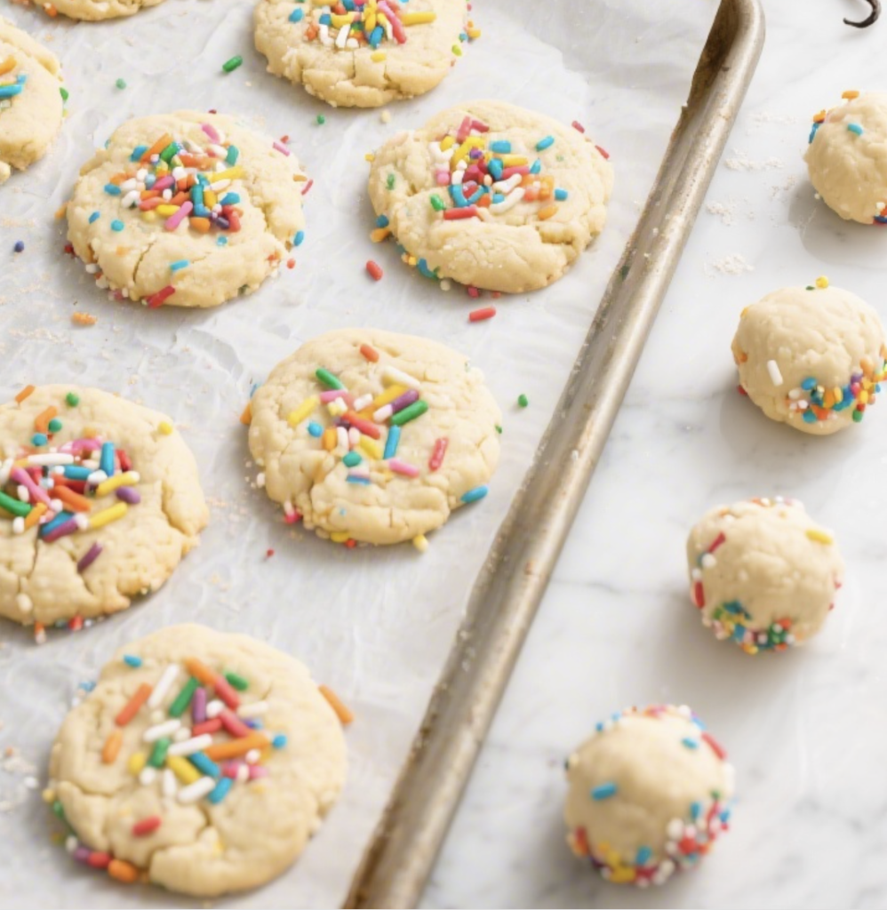 5. Use a tablespoon or cookie scoop to portion dough into balls (about 1 tablespoon each). Roll each ball in sprinkles to coat.