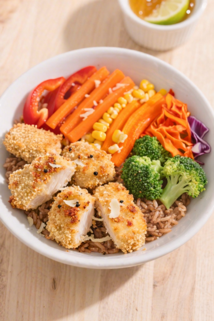 Think of this as the glow-up version of chicken nuggets. You get the crunch kids love, plus a rainbow of veggies and a zippy sauce that ties it all together. Perfect for build-your-own bowls—everyone assembles their favorites, and dinner happens without negotiation.