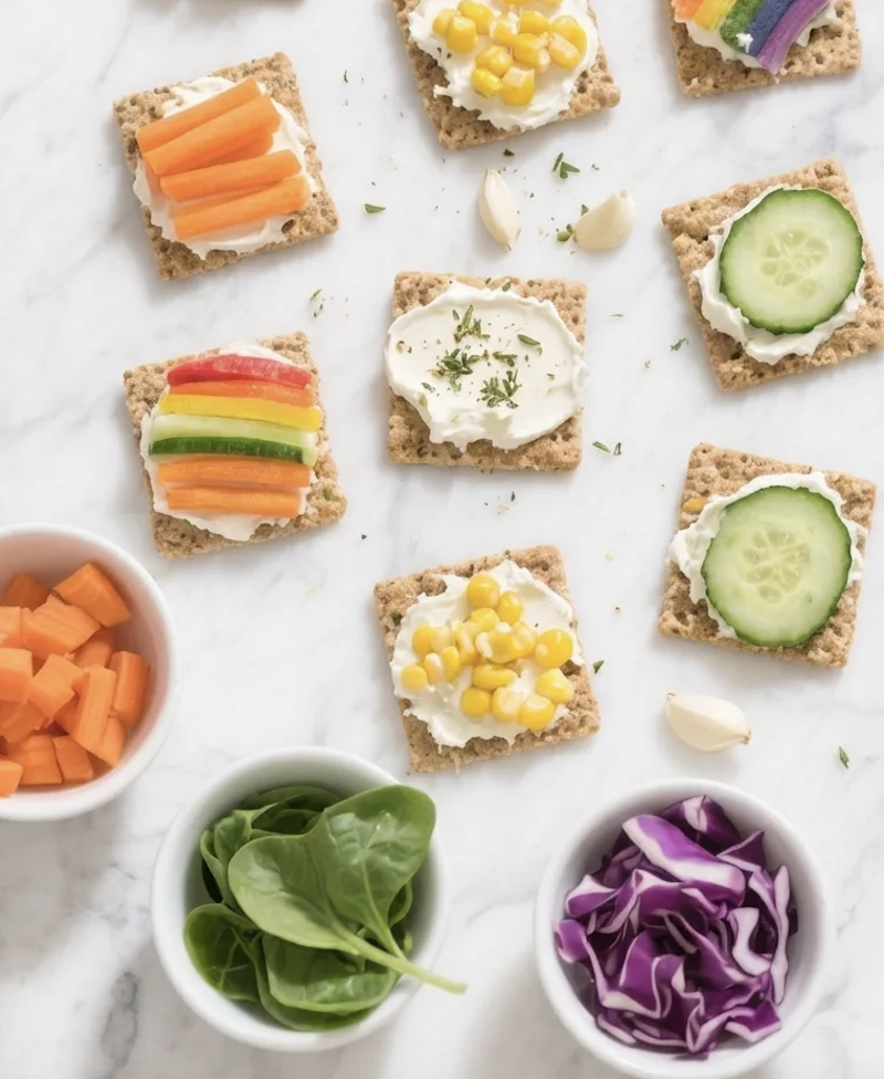 1. Rainbow Veggie Pizza Crackers Kids Build Themselves