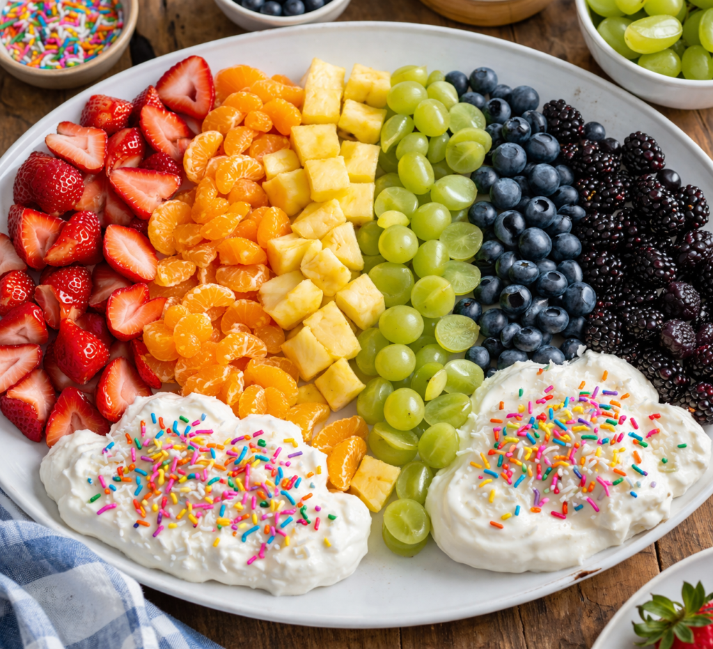 This is the showstopper that gets kids sprinting to the table. A simple ROYGBIV lineup looks like a magic trick—bright, neat, and unbelievably inviting. The fluffy yogurt dip “clouds” seal the deal, especially if you add sprinkles for confetti vibes.