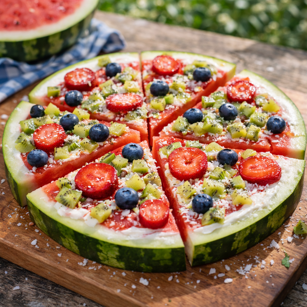 This one delivers big summer energy with minimal effort. A round watermelon slice becomes your “pizza,” and you top it with creamy spread, kiwi confetti, and berry “pepperoni.” It’s silly, sharable, and perfect for picnics or backyard snacks.