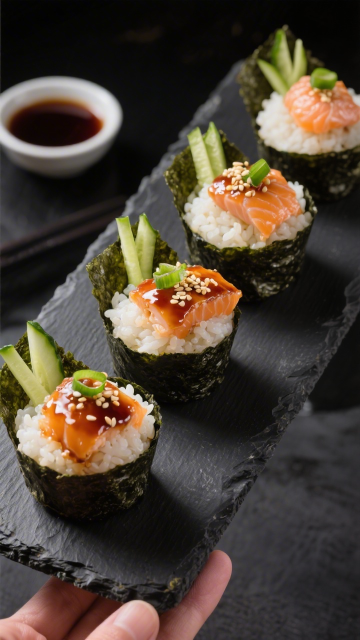 Serve with edamame and orange slices. Variation: swap salmon for chicken thigh pieces (bake 14–16 minutes) or tofu cubes. Pro tip: brush the muffin tin with oil so the nori crisps instead of sticking.